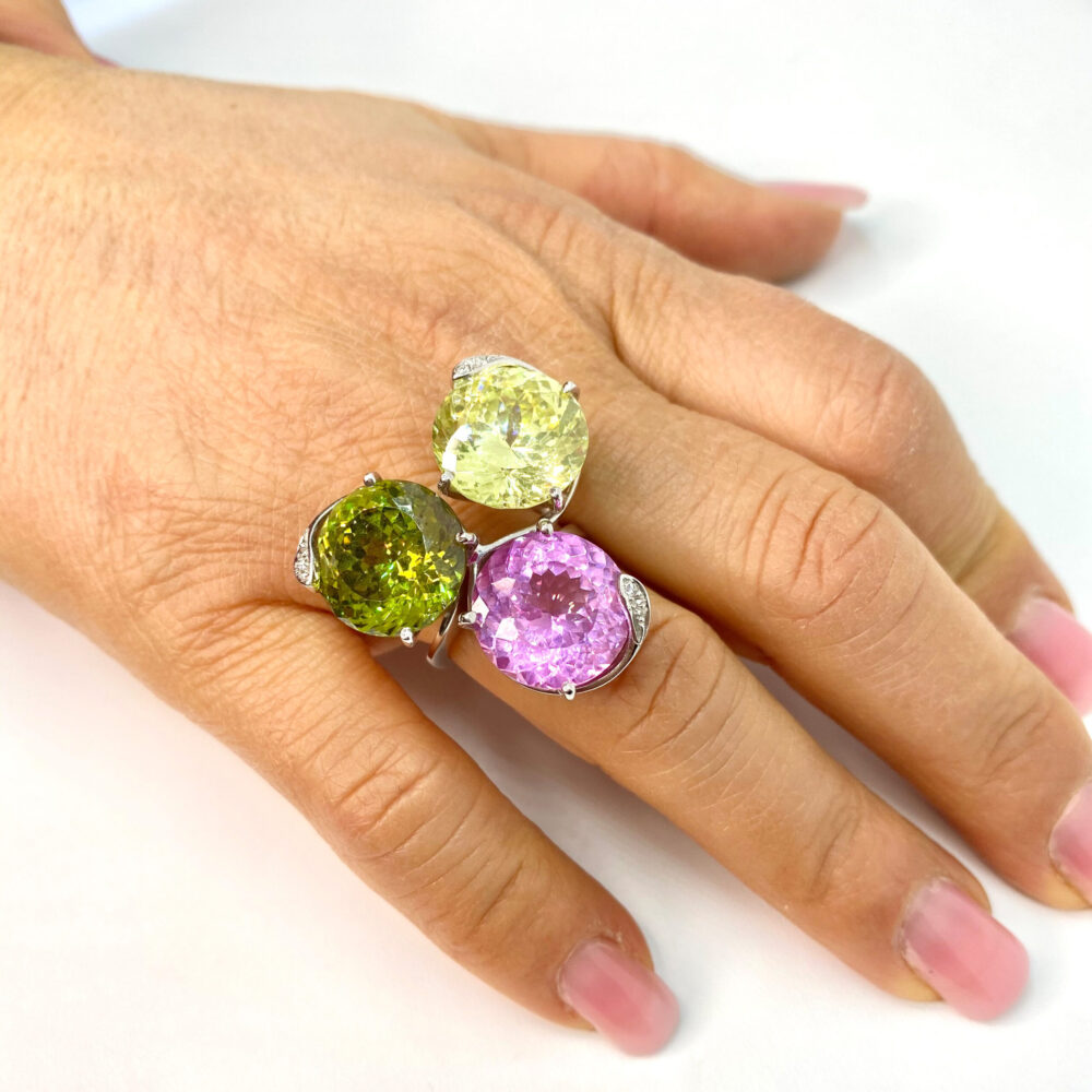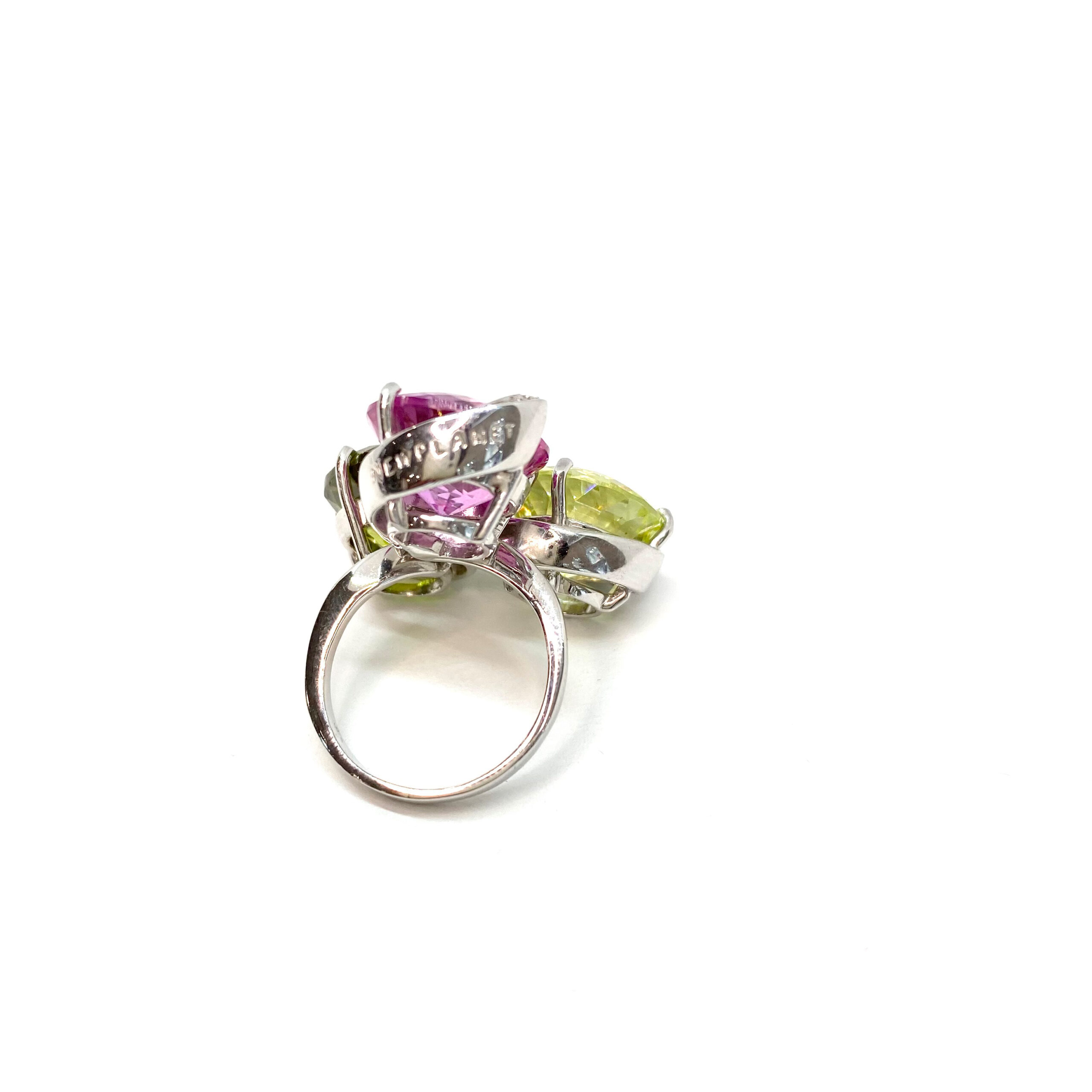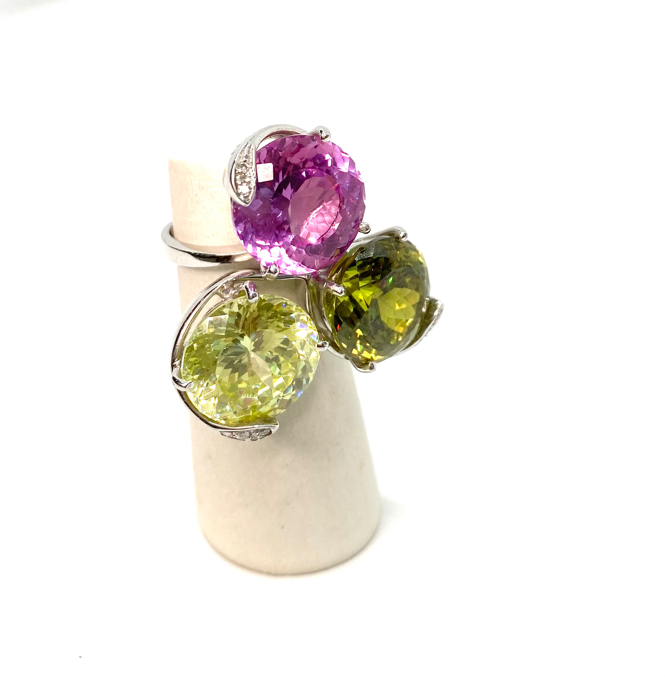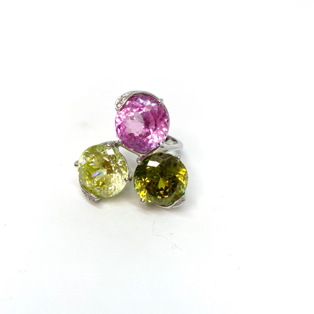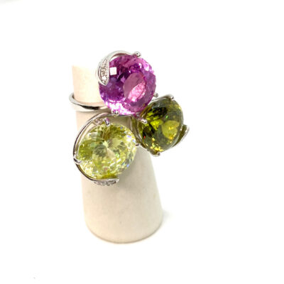 Anello Oro Bianco 18kt con Diamanti bianchi (ct 0,06) con tormalina Verde Lime, Verde Mela e Rosa di Francia.