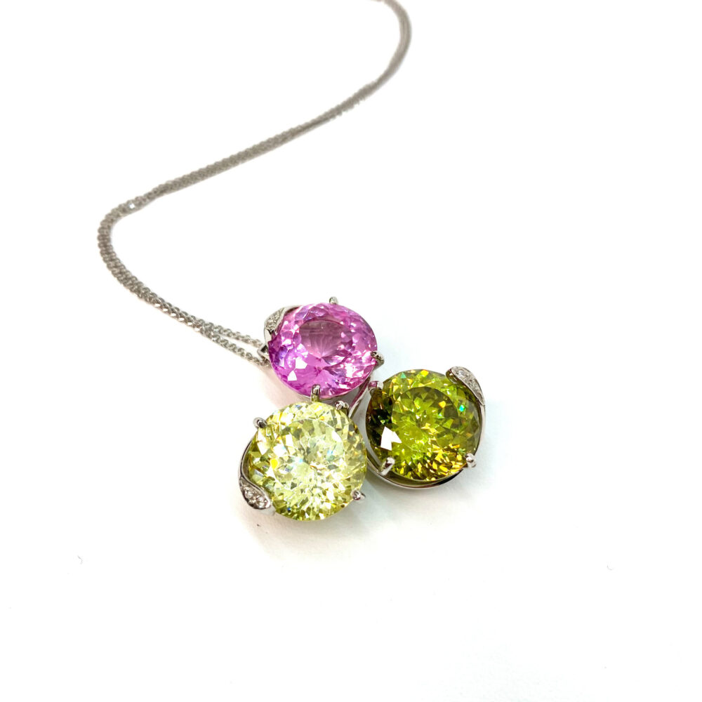Ciondolo Oro Bianco 18kt con Diamanti bianchi (ct 0,06) con tormalina Verde Lime, Verde Mela e Rosa di Francia. Completo di Collanina in oro Bianco.