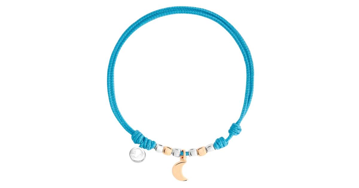 Bracciale con charm Luna modello mini in oro rosa 9K, quattro mini Granelli in argento 925 e due mini Granelli in oro rosa 9K, cordino azzurro e sigillo in argento 925.