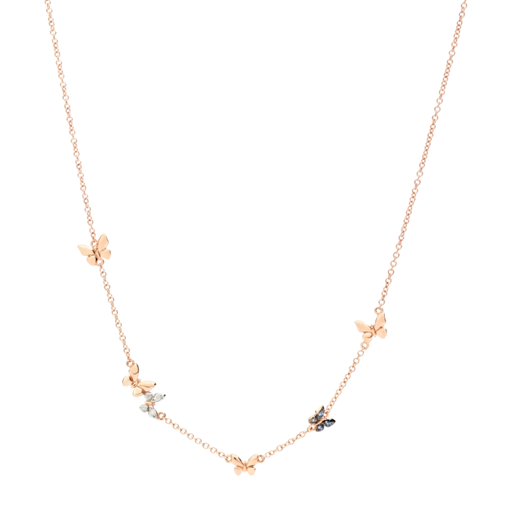 Collana Farfalla in oro rosa 9K con 4 diamanti bianchi (ct 0.04) e 4 zaffiri blu (ct 0.05). Piastrina in oro rosa 9K.