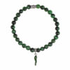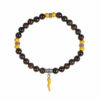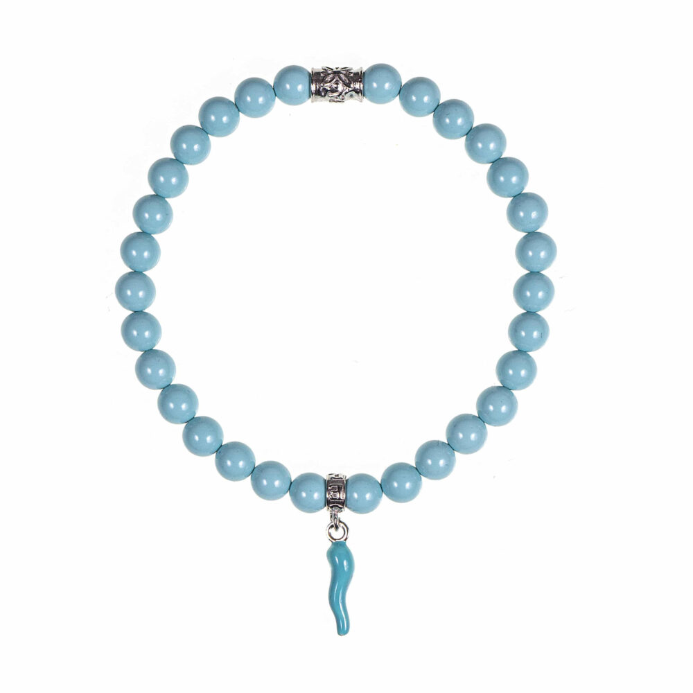 Bracciale con perle in occhio di tigre, cornetto smaltato in celeste e altri componenti in argento 925.