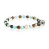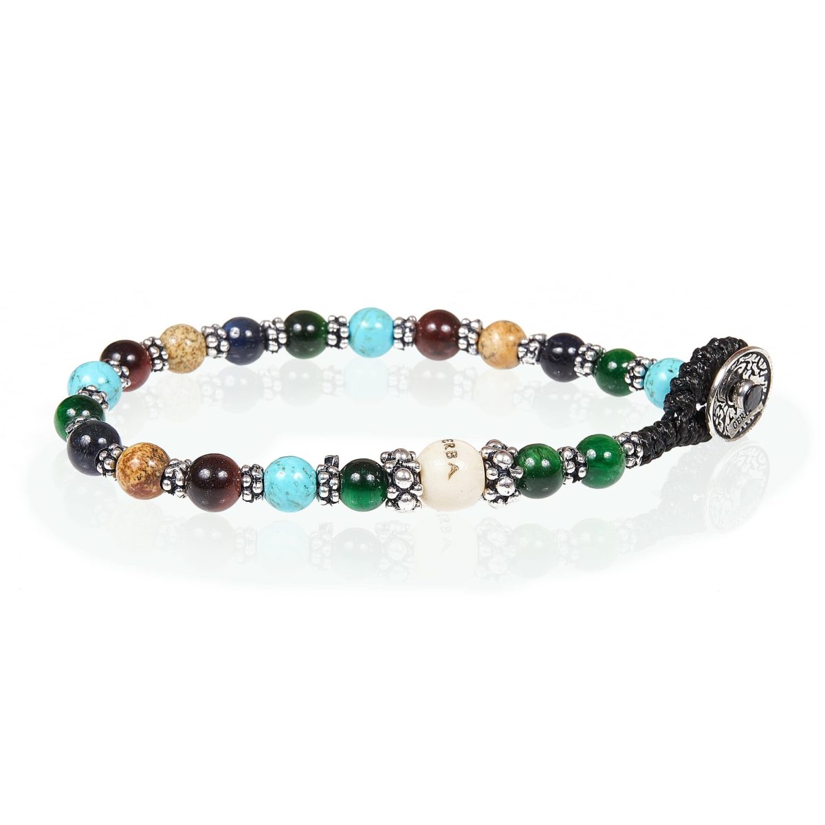 Bracciale da uomo, modello Lab 083. Realizzato a mano con cordino in filo cerato, con Turchese, Paesina e Occhio di Tigre e con componenti in argento 925. Bracciale multicolor con pietre di 6 mm. Chiusura a bottone in argento e metallo.
