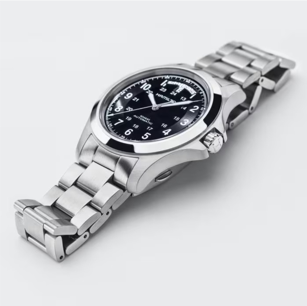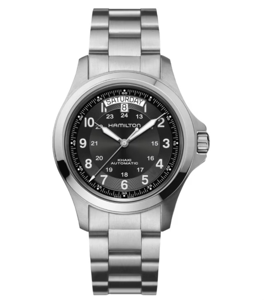 La tradizione militare Hamilton si rintraccia sul quadrante di questo splendido segnatempo Khaki Field King Auto con protezioni appositamente progettate per garantire la sicurezza della corona in ogni momento. Lunga vita al re.