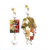 La collezione kimono utilizza per la realizzazione degli orecchini antiche sete di kimono giapponesi, stese con un procedimento particolare su un’anima di legno leggerissima. Le pietre sono tutte pietre naturali e gli elementi sono montati con elementi in ottone galvanizzato. La coppia di orecchini è asimmetrica; a un lobo un manichino vestito con kimono e all’altro un ideogramma giapponese che significa luce. montati con elementi in ottone galvanizzato.