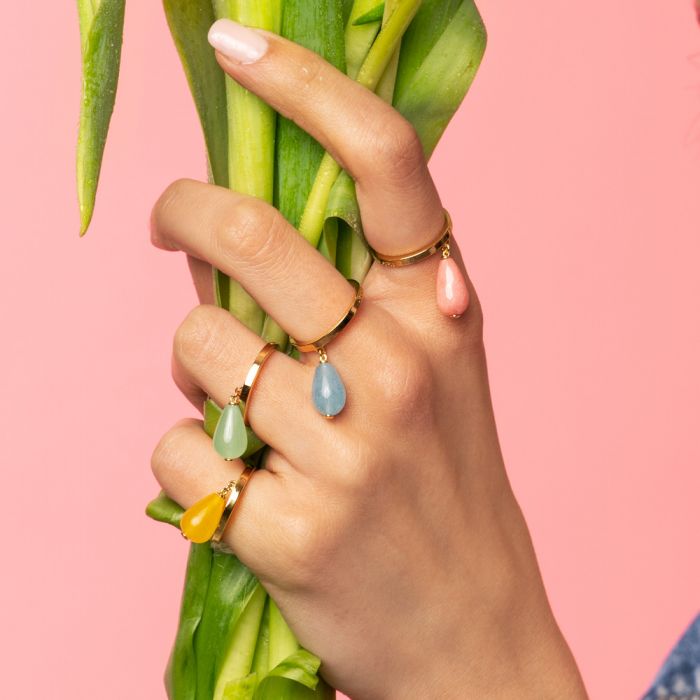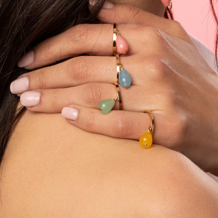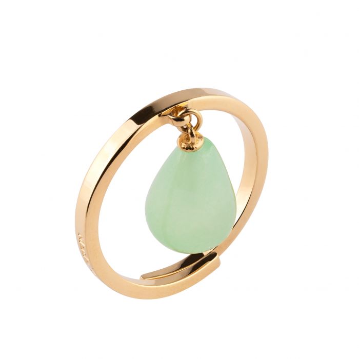 Anello Tulipe in bronzo placcato oro con pietra verde chiaro pendente.