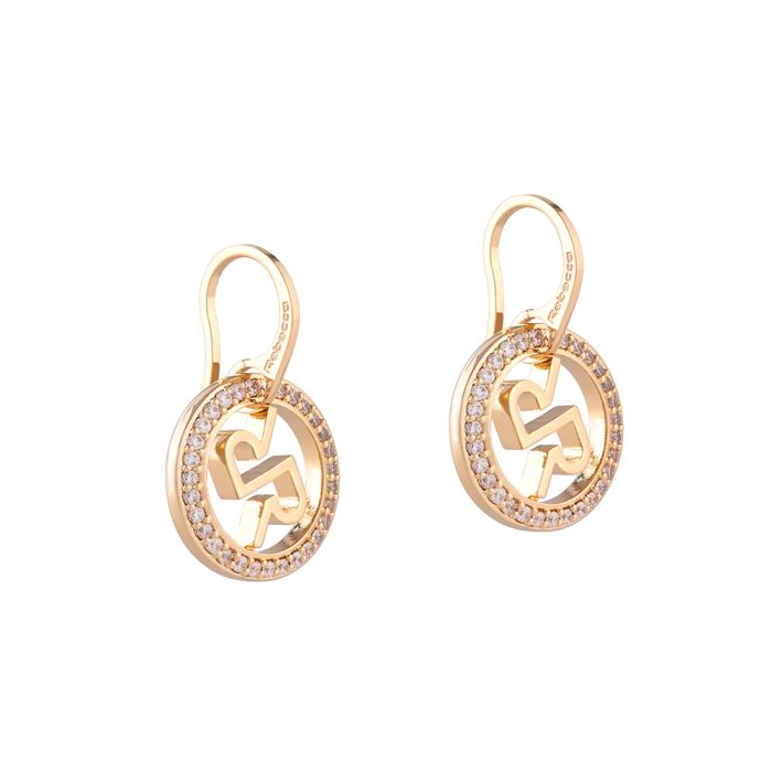 Orecchini Icon con pendente logo Rebecca e zirconi bianchi. Gioiello realizzato in Bronzo placcato oro 24KT.