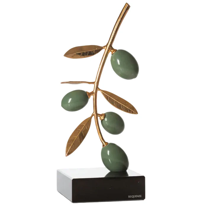 Rami d’ulivo decorativi con foglie dorate e olive verdi su base nera lucida, simbolo di pace e tradizione mediterranea.