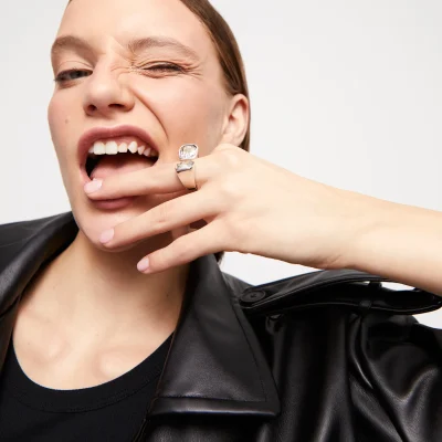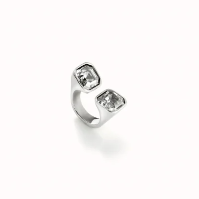 Gioielli per persone senza complessi, che vogliono farsi notare indossando le forme geometriche di questi pezzi. Una collezione di chiara ispirazione cubista rivisitata in chiave attuale. Forme che si scompongono e ricompongono, offrendo infinite possibilità di mix&match, placcate oro o argento e con cristalli sfaccettati in bianco e nero.