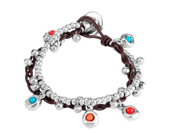 Bracciale da donna di cuoio a doppio giro con pendenti di resina di vari colori e perle bagnate in argento. Rendi tuo questo accessorio realizzato in Spagna da UNOde50.