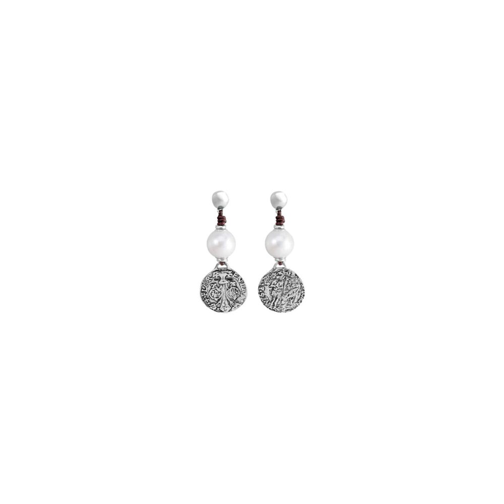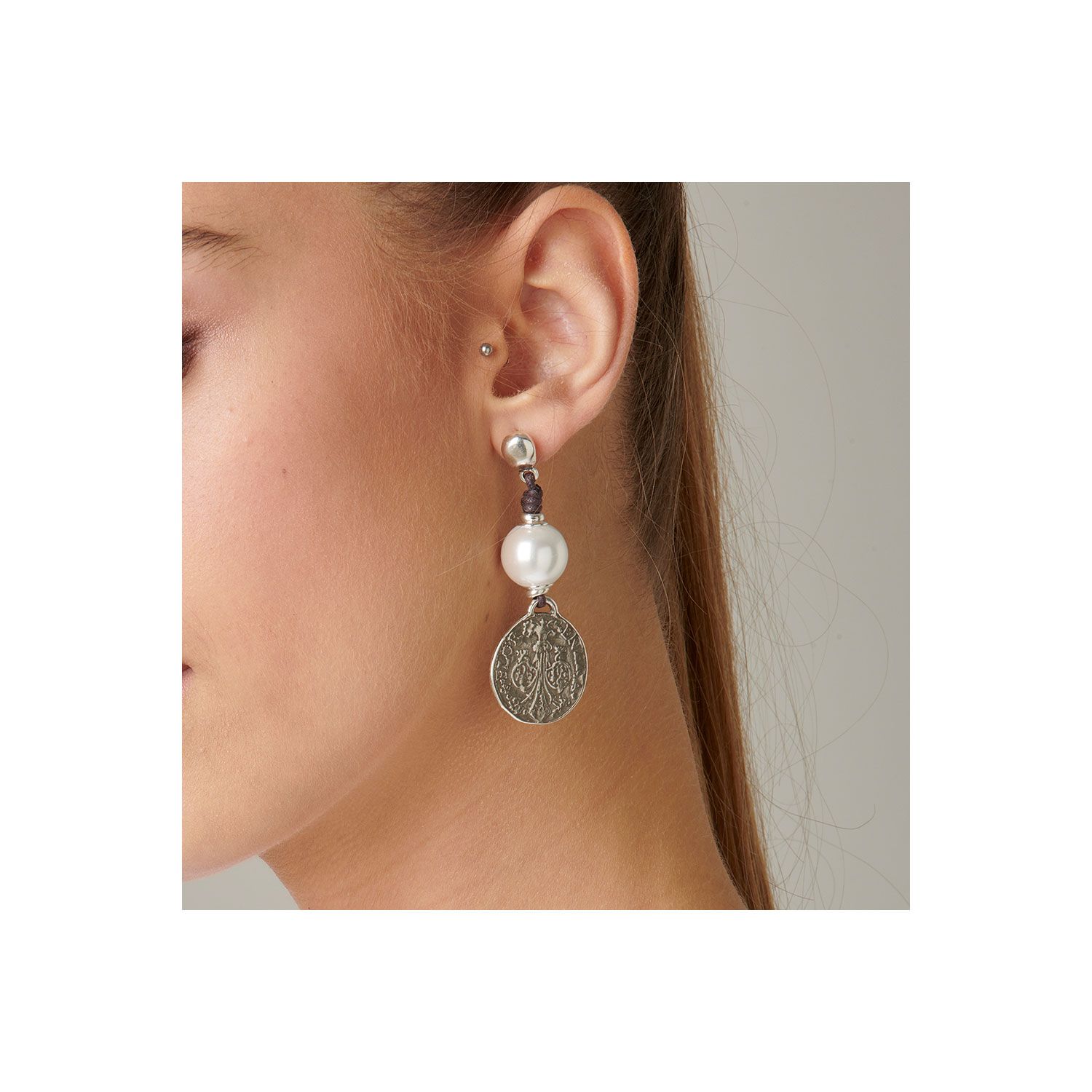 Orecchini da donna con perla e moneta antica, bagnati in argento.