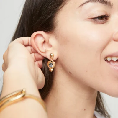 Orecchini placcati oro 18k con cuore pendente e cristallo nero.Ser Expresiva significa essere trasparente. Trasmettere le tue emozioni e idee in modo energico, sconvolgente e autentico. Arrischiarsi a indossare colori vivaci. Vivere con passione. Essere aperta e onesta. Portare a spasso il cuore come un gioiello. Giocare con le tue collane, a modo tuo. Il momento di Ser Expresiva è ora.
